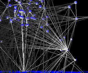 ![]() Dante's Inferno SGML VizSpring 1997 For IATH, using perl-generated VRML from SGML My first SGML work, a big breakthrough for me personally. The lines in this image represent the 34 cantos of Dante's Inferno, and the points indicate individual lines. The triangular markers represent occurences of tags that were selectable via an HTML form. The resulting VRML world could then be navigated via a VCR widget. |